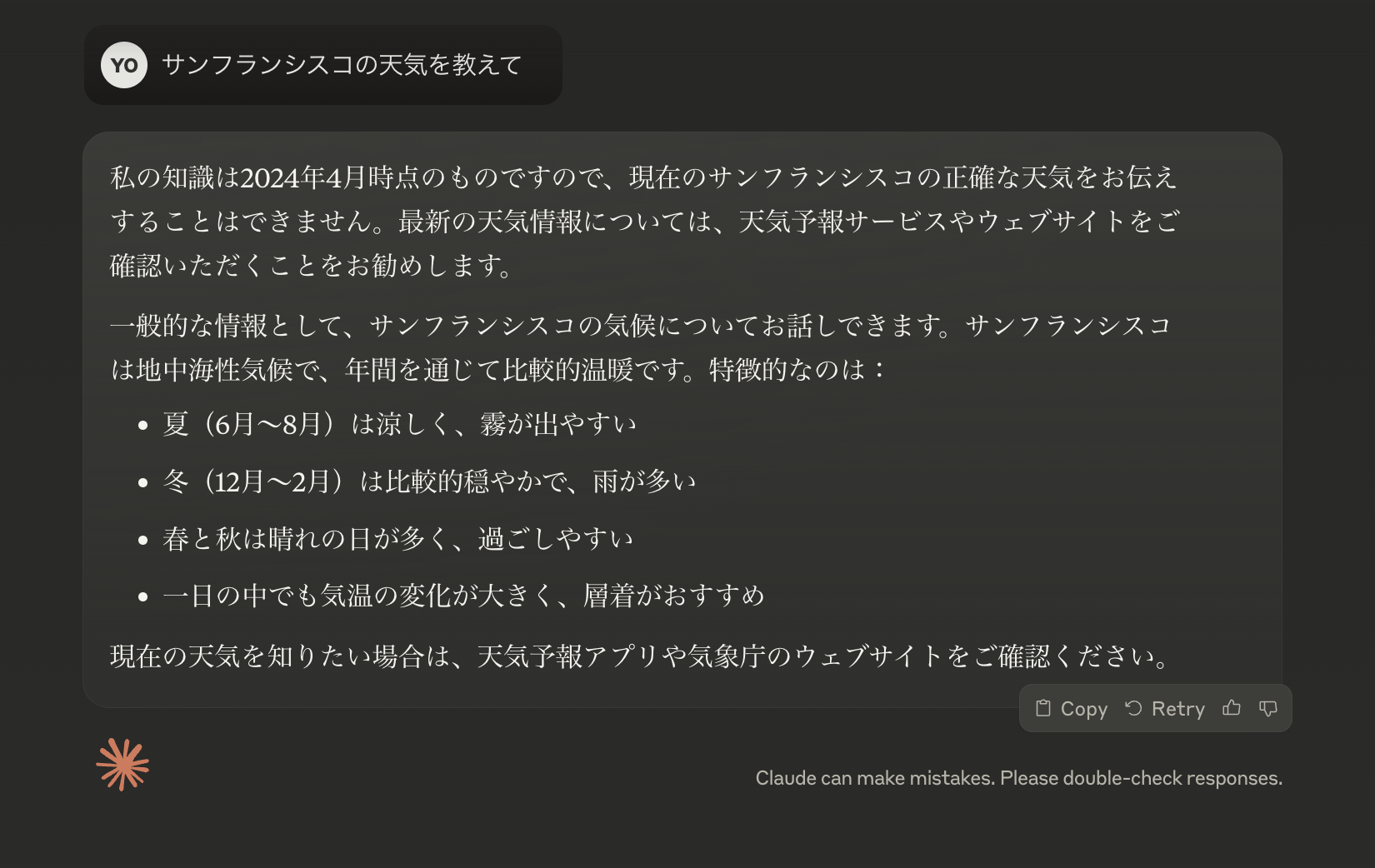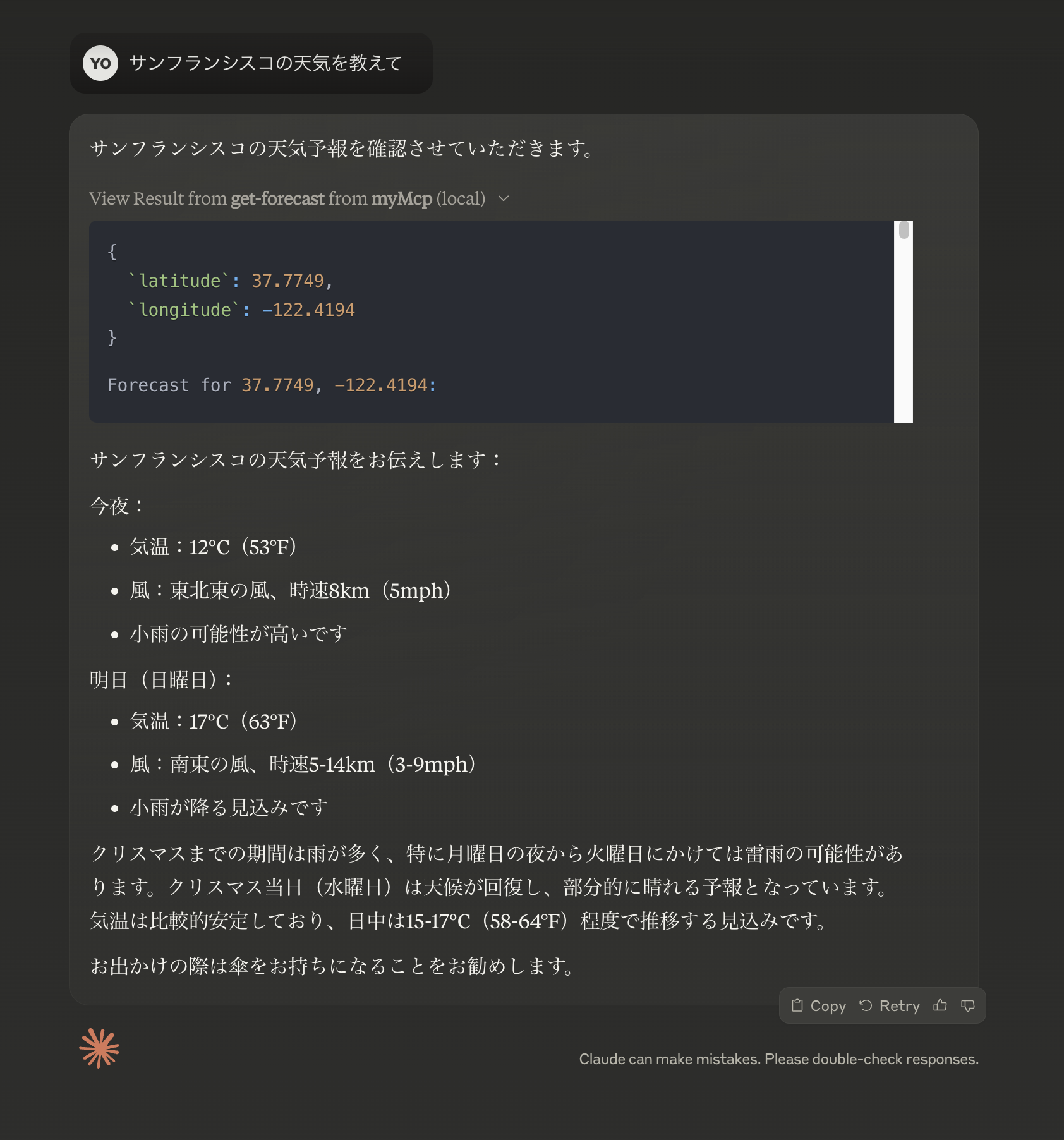 試しにサンフランシスコの天気を聞くと、MCPサーバーから天気予報の情報を取得し、生成AIのメッセージに天気の情報が組み込まれていることがわかる。